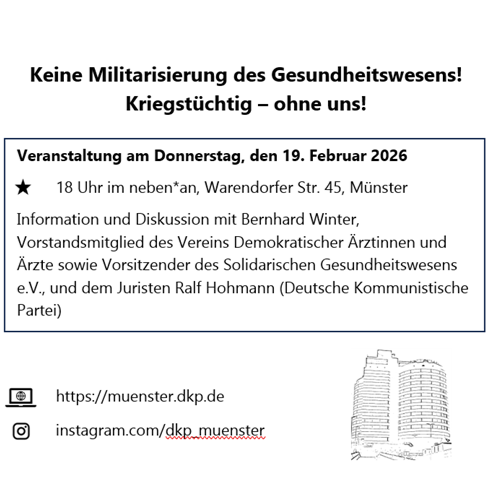 Veranstaltung am Donnerstag, den 19. Februar 2026, 18 Uhr im neben*an, Warendorfer Str. 45, Münster. Information und Diskussion mit Bernhard Winter, Vorstandsmitglied des Vereins Demokratischer Ärztinnen und Ärzte sowie Vorsitzender des Solidarischen Gesundheitswesens e.V., und dem Juristen Ralf Hohmann (Deutsche Kommunistische Partei). 2025 gaben fünf Bundestagsabgeordnete unterschiedlicher im Bundestag vertretener Parteien das sogenannte Grünbuch zivilmilitärischer Zusammenarbeit heraus. Darin stellen sie…