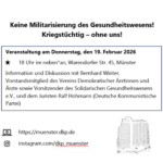 Veranstaltung am Donnerstag, den 19. Februar 2026, 18 Uhr im neben*an, Warendorfer Str. 45, Münster. Information und Diskussion mit Bernhard Winter, Vorstandsmitglied des Vereins Demokratischer Ärztinnen und Ärzte sowie Vorsitzender des Solidarischen Gesundheitswesens e.V., und dem Juristen Ralf Hohmann (Deutsche Kommunistische Partei). 2025 gaben fünf Bundestagsabgeordnete unterschiedlicher im Bundestag vertretener Parteien das sogenannte Grünbuch zivilmilitärischer Zusammenarbeit heraus. Darin stellen sie… Read more →